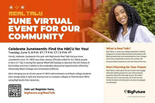Real Talk is a career and college exploration initiative designed to connect Black students and families with Black professionals and representatives from colleges and access organizations across the country. We empower Black students to own their future their way.